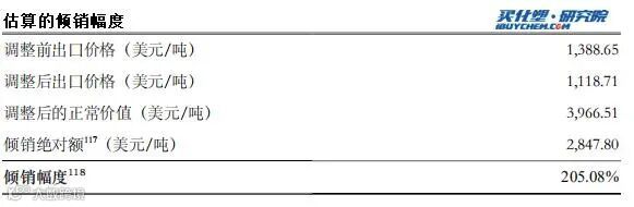 2016年,原产于美国的相关乙二醇单烷基醚的进口完税人民币价格尚高于国内同类产品的销售价格。但从2017年开始,进口价格便低于国内同类产品的售价。2017至2019年期间存在明显的削价销售。据估算,2019年1-12月期间美国向中国出口的相关乙二醇和丙二醇的单烷基醚的倾销幅度为205.08%。