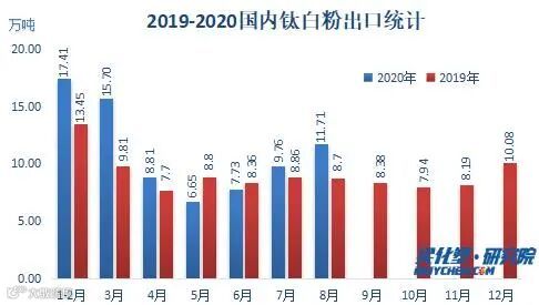 从今年下半年开始,钛白粉出口稳定增加,据最新的