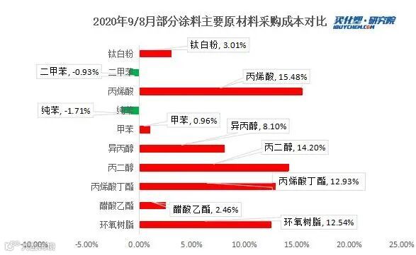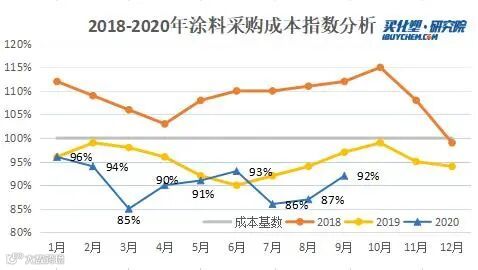市场景气程度持续回升,国内涂料主要原材料价格也大幅上涨,据买化塑研究院涂料采购成本指数显示,2020年9月指数为92%,环比上涨5个百分点,丙二醇、丙烯酸、丙烯酸丁酯、环氧树脂、钛白粉等涂料主要原材料价格均出现较大幅度上涨,尤其钛白粉,双节前后接连调涨。