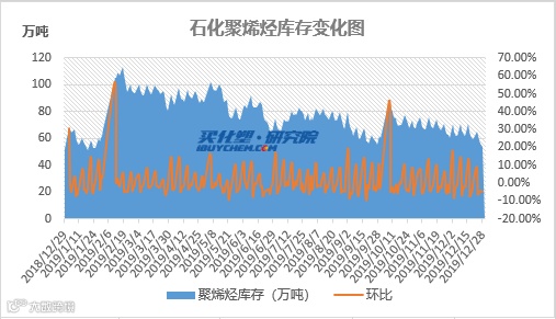 据买化塑研究院【化塑产业链决策系统】跟踪的数据显示,12月27日石化聚烯烃库存为53.5万吨,创1月底以来最低库存数据。