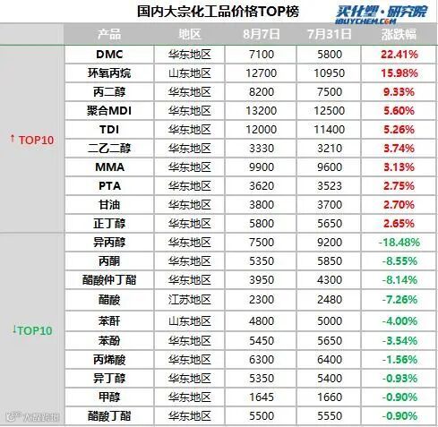 本周涨幅前三产品分别是DMC、环氧丙烷、丙二醇,涨幅分别为22.41%、15.98%、9.33%;
