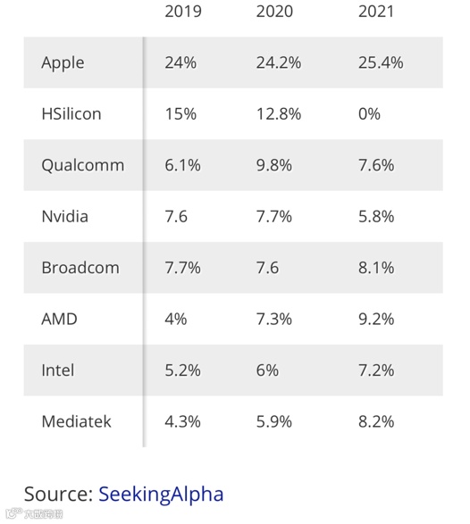 随着市场份额和出货量的增加,AMD在2019年至2020年大幅增加了从台积电的采购。根据Seeking Alpha 发布 的The Information Network的估计,2019年,AMD的产品占台积电收入的4%,到2020年增至7.3%,并有望在2021年增至9.2% 。即使AMD未能在2021年达到分析师的预期,但在未来几年与Xilinx合并后,AMD仍将大幅增加从台积电的采购。