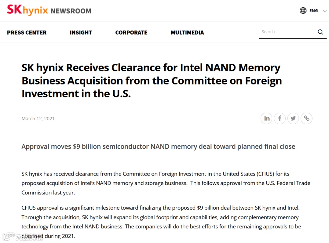 国际电子商情12日从SK hynix官网获悉,其以90亿美元收购英特尔NAND储存业务案已经通过美国外国投资委员会 (CFIUS) 签字放行。该交易在去年年底通过了联邦通商委员会(FTC)的反垄断审查。