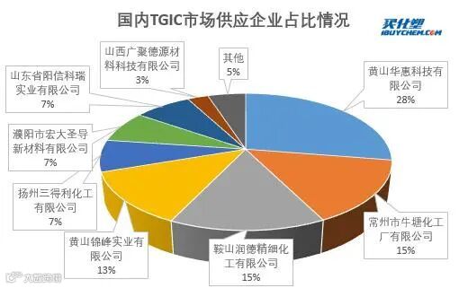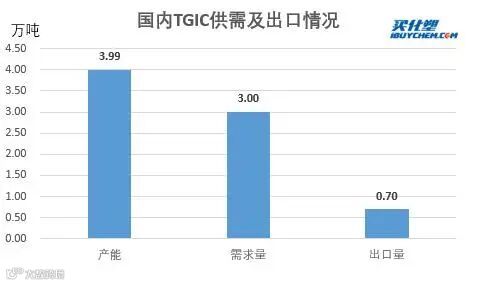 据统计数据显示,2019年国内TGIC产能约4万吨左右,国内整体需求约在3万吨,出口约0.7万吨。从企业产能布局来看,行业92%的产能被7家企业占据,分别为