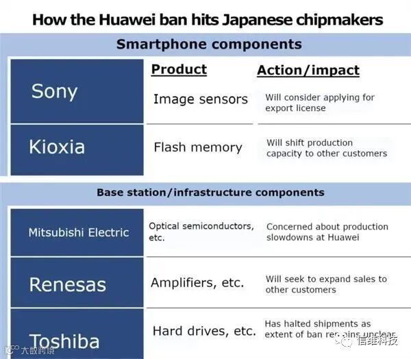受到波及的还有华为的基站等基础设备,比如三菱电机供应的光学半导体器件、瑞萨供应的放大器、东芝供应的硬盘等。
