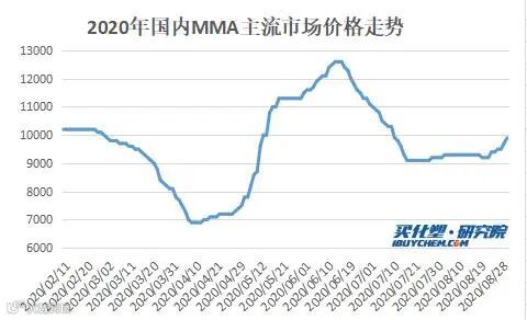 8月份,国内MMA中上旬市场稳中偏弱,月底市场反弹。8月整体开工率保持在六成左右,较上月开工有所提升,供应面相对充足。进入9月,国内MMA市场市场重心走高,吉林石化20万吨/年MMA低负荷运行及山东宏旭7.5万吨/年的丙酮氰醇法MMA装置低负荷运行,国内工厂开工负荷下降,现货偏紧,9月初华南地区高价已涨至10500元/吨。