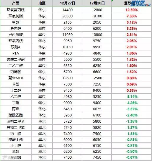 据买化塑研究院监测的部分主要大宗化工品数据显示,截止至12月27日,涨幅最高的产品为