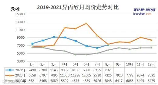 异丙醇:8月华东地区受疫情影响,加之在丙酮上涨的带动下,异丙醇成本大幅上升,价格大幅上涨。随着成交增多,价格推涨乏力,虽然工厂得到利润,但贸易商成交困难,工厂月底新订单偏少,价格开始回落,尤其随着丙酮的下跌,异丙醇价格出现下滑。截止至8月31日,华东地区异丙醇市场价格7400-7450元/吨,较7月底涨950元/吨,8月均价7161元/吨,环比涨12.69%。