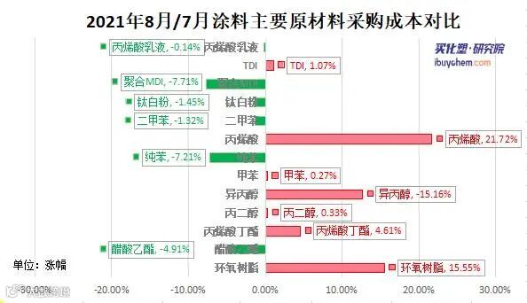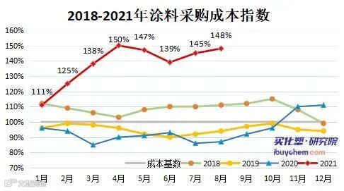 从涂料采购成本来看,8月涂料主要原材料环氧树脂、丙烯酸丁酯、丙二醇、异丙醇、甲苯、丙烯酸等产品价格上涨,尤其环氧树脂、丙烯酸及酯涨势明显。但钛白粉、二甲苯、醋酸乙酯、聚合MDI等产品价格也出现不同程度下滑。据买化塑研究院涂料采购成本指数显示,8月指数为148%,环上涨3个百分点。
