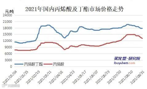 丙烯酸丁酯跟随丙烯酸走势涨后大幅走跌,截止到8月31日,江苏地区市场价格17700-7900元/吨,较7月下降1200元/吨,8月均价18829.55元/吨,月均价环比涨4.35%。月初,国内丙烯酸丁酯延续7月底上涨走势,市场价格一路飙升至19600元/吨高位,同样创下年内新高。但市场价格到达高点后下游抵触逐步提升,加上下游整体开工负荷偏低,按订单生产,对原料丙丁酯的需求量明显降低,临近月底持货商积极出货,加之出口订单的延期,加大市场现货供应量,原本供应偏紧的市场转变成现货供应充足,供大于求之下市场低价不断出现,价格一跌再跌。