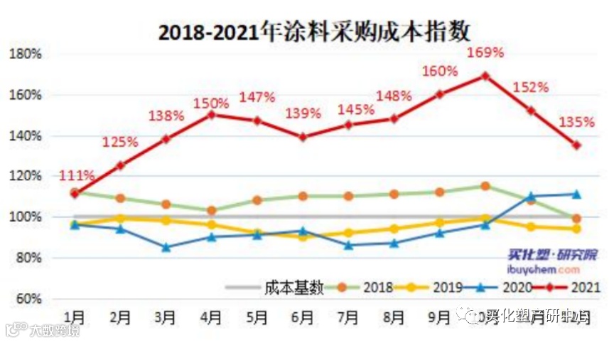 2021年涂料采购成本指数较前几年有较大的提升,在2021年10月达到顶峰,为169%;随后开始下跌。截至12月,涂料采购成本指数为135%。2021年涂料采购成本指数的上涨主要跟2021年涂料原材料普涨,价格纷纷创近年历史新高有很大原因。