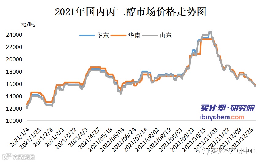 10月20日国内丙二醇创历史新高24500元/吨,高位持稳至不到一周时间。伴随检修装置陆续恢复,市场供应端利空增加。原料环氧丙烷成本支撑不足,10月底到12月,丙二醇受需求影响市场开始跌落。