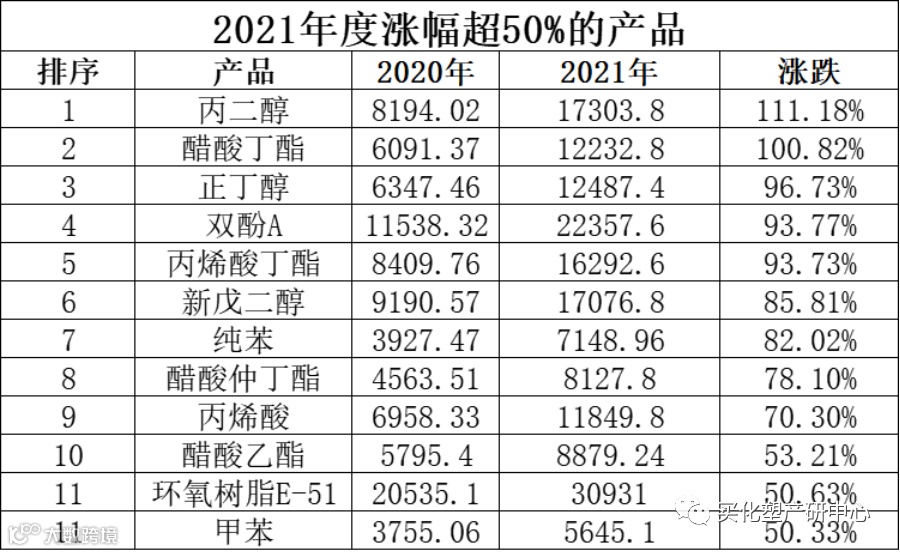 从跟踪的25个涂料原材料产品中,除了异丙醇下跌,其余的24个产品都上涨,且涨幅最低的丙烯,2021年均价都同比去年上涨了17.19%;2021年上涨跌幅超过50%的就有11个产品,其中丙二醇涨幅最大,同比去年上涨111.18%,醋酸丁酯紧跟随后,上涨100.82%,正丁醇以上涨96.73%排列第三。
