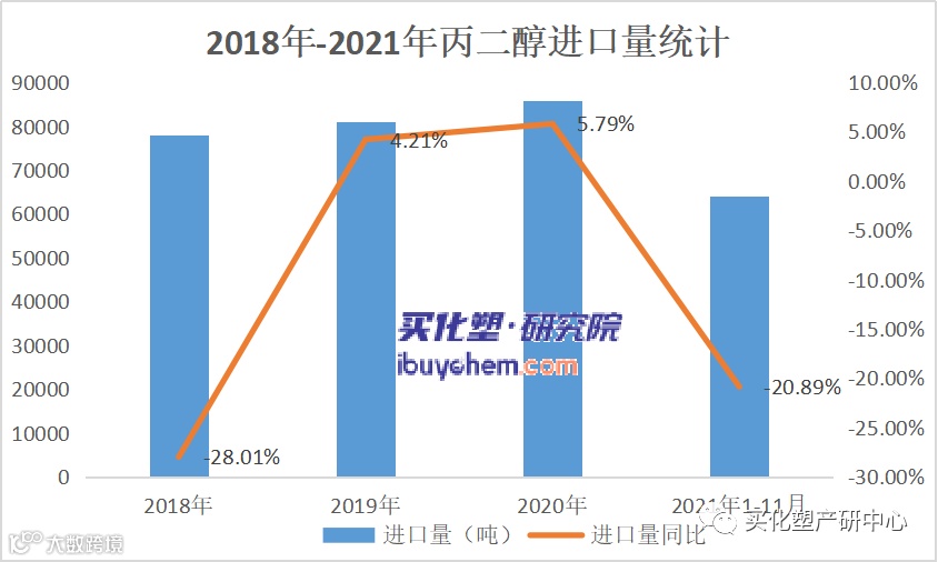 2021年1-11月年丙二醇进口量下滑至约6.4万吨/年,同比2020年1-11月进口量下降20.89%。我国目前高品质丙二醇依旧依赖进口,以医药级为主,主要来自泰国(陶氏)、韩国、沙特和新加坡等。2021年进口量下降的原因主要有: