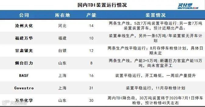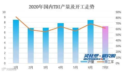 从装置情况来看,目前除万华化学TDI装置例行检修,其他供应商装置平稳运行,但甘肃银光TDI装置8月存停车检修计划。本周TDI开工率较为稳定,预计7月TDI开工率维持在62%。