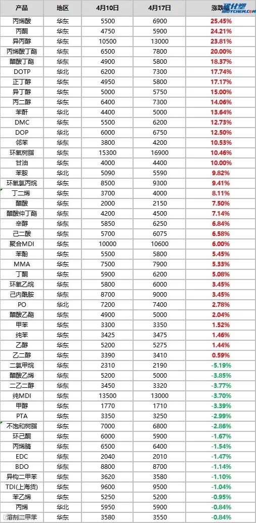 涨幅前三产品分别是丙烯酸、丙酮、异丙醇,涨幅分别为24.45%、26.67%和23.81%