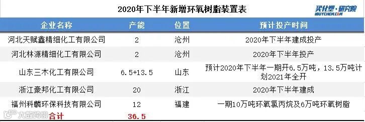据买化塑研究院统计,2020年下半年国内环氧树脂行业预计新增5套装置,合计产能36.5万吨/年,如下半年新装置顺利投产,我国环氧树脂产能将超260万吨/年。
