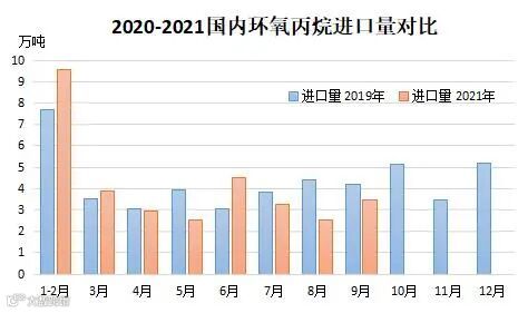 据海关数据显示,2021年9月中国环氧丙烷出口量在0.016万吨,上月及去年同期均为0出口。1-9月中国环氧丙烷总出口量0.17万吨,较去年同期缩减95.76%。9月中国环氧丙烷进口量3.48万吨,环比上月增长37.77%;1-9月环氧丙烷总进口量32.73万吨,较去年同期略增0.91%。