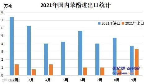 据海关数据显示,2021年前3季度中国苯酚出口量9.72万吨,较2020年同期增加8.37万吨,同比增长618.64%。其中9月苯酚出口量高达3.34万吨,同比增长32304.45%,环比增长337.51%,是近10年来苯酚月度出口量的峰值。