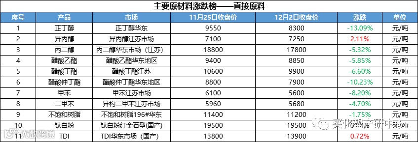 1、主要原材料涨跌榜-直接原料