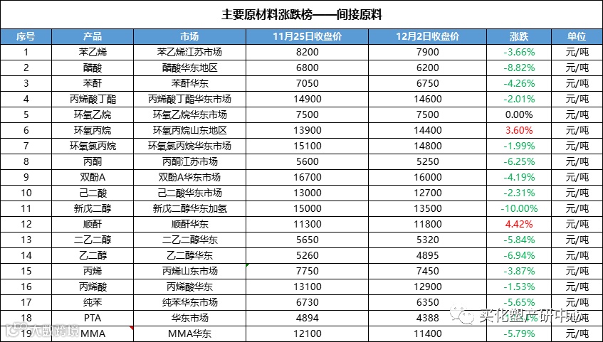 2、主要原材料涨跌榜-间接原料