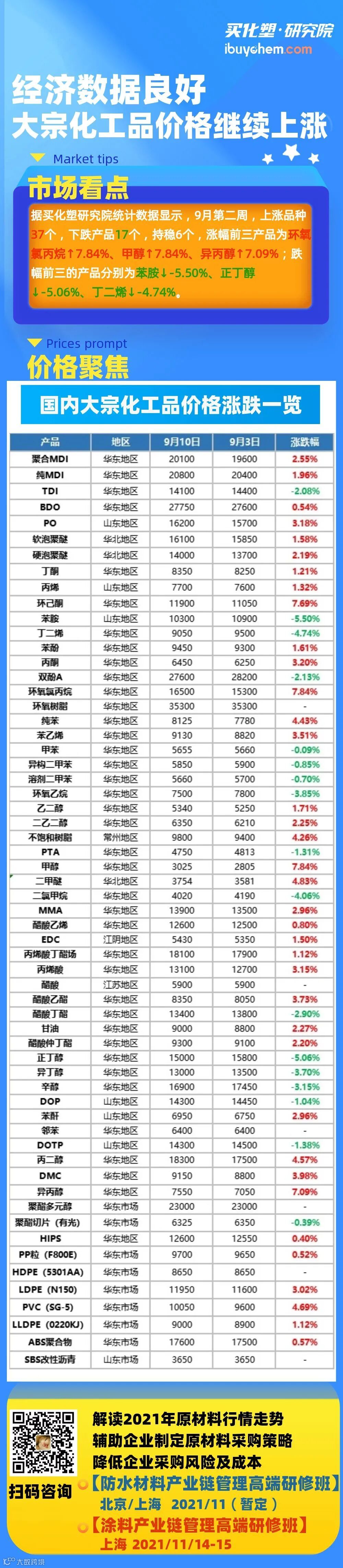 据买化塑研究院统计数据显示,9月第二周,上涨品种37个,下跌产品17个,持稳6个,涨幅前三产品为环氧氯丙烷↑7.84%、甲醇↑7.84%、异丙醇↑7.09%;跌幅前三的产品分别为苯胺↓-5.50%、正丁醇↓-5.06%、丁二烯↓-4.74%。