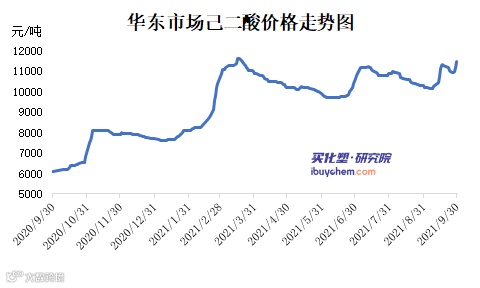 9月己二酸市场以震荡上行为主。月初受江苏海力及太化装置预计重启影响,市场气氛偏空,价格小幅回落。但进入中旬之后,原料纯苯价格大幅上行形成成本带动,工厂多次上调价格。另外,装置重启暂缓,也形成供应紧张预期。受此带动,己二酸市场价格不断走高。不过9月下旬,原料市场走软,以及山东海力及太化装置重启,供应端增量,现货价格小幅回落。但是进入月底在“双控”政策影响下,以及原油、纯苯等价格不断走高带动,己二酸市场价格再次抬升,并上涨至年内高点11600-11650元/吨附近。