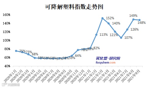 据买化塑研究院【化塑产业链决策系统】监测的数据显示,9月可降解塑料指数为148%,环比回落1%。