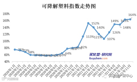据买化塑研究院【化塑产业链决策系统】监测的数据显示,11月可降解塑料指数为164%,环比上涨1%。