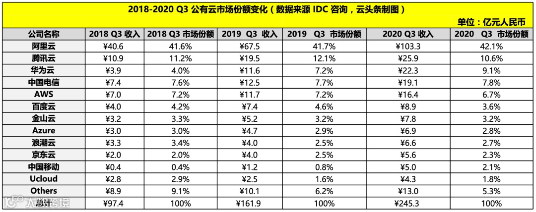 阿里云2020年市场份额比2018年增加0.5%至42.1%;收入增长154.8%至103.3亿元;腾讯云+华为云+天翼云+AWS+百度云+金山云=100.4亿元,接近于阿里云的收入。