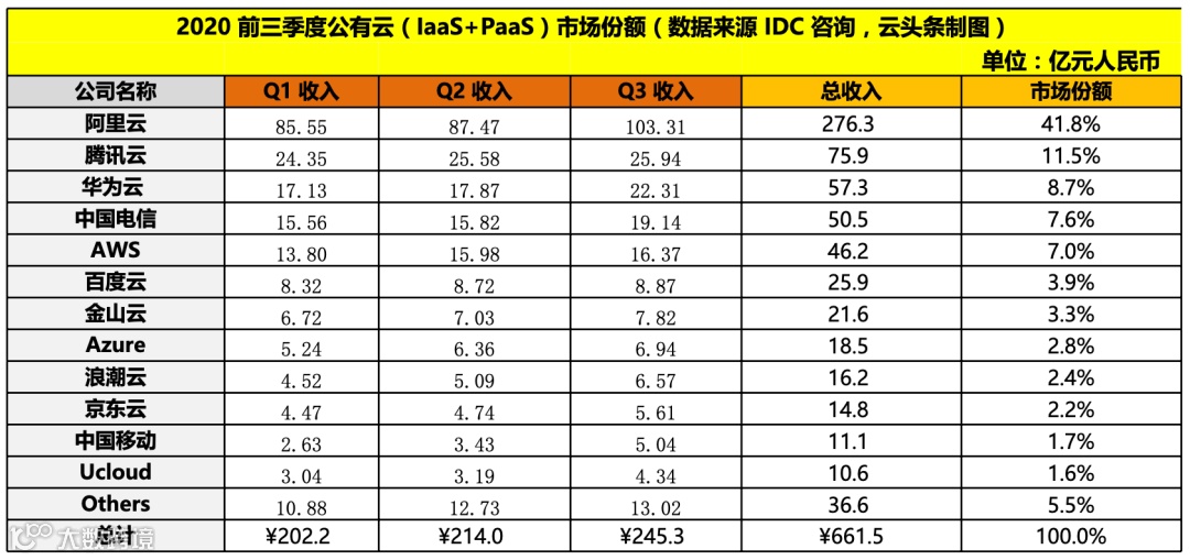 2020年前三个季度阿里云(IaaS+PaaS)共收入276.3亿元。