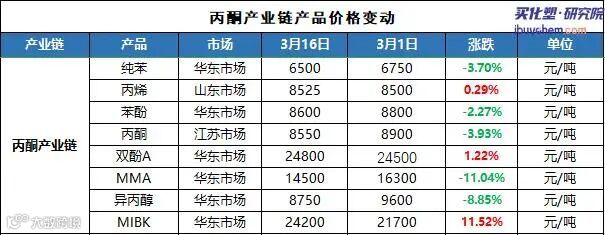 3月初至今,国内丙酮产业链产品出现涨跌互现局面,与月初相比,除原料丙烯和双酚A、MIBK产品呈现上涨势头外,其他产品均进入下行轨道。