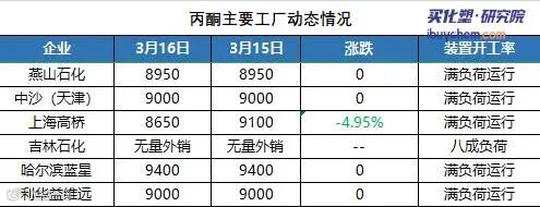 丙酮承压下滑,截止至3月16日,华东丙酮市场价格降至8500-8600元/吨,中石化三井丙酮报价下调450元至8650元/吨出厂,价格自3月16日起执行;高桥石化丙酮价格下调450元/吨,执行8650元/吨现汇自提,此价格自3月16日执行。