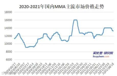 国内MMA市场市场小幅下跌,临近月底,新约商谈尚未展开,交投多观望,实单成交有限。截止至8月24日,华东市场价格13100-13300元/吨;华南市场价格13900-14000元/吨,较月初下跌1200-1400元/吨。