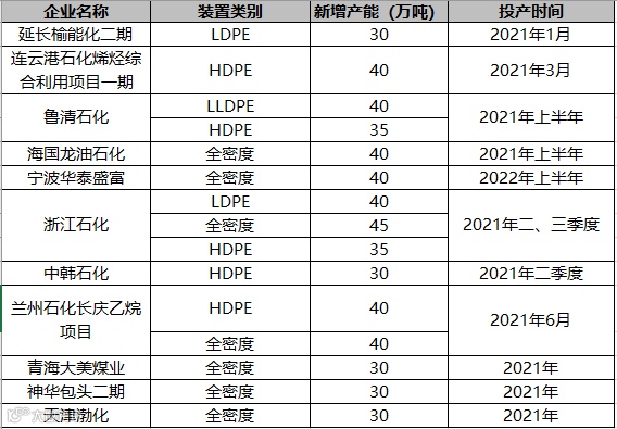 2021年国内PE投产装置及产能计划