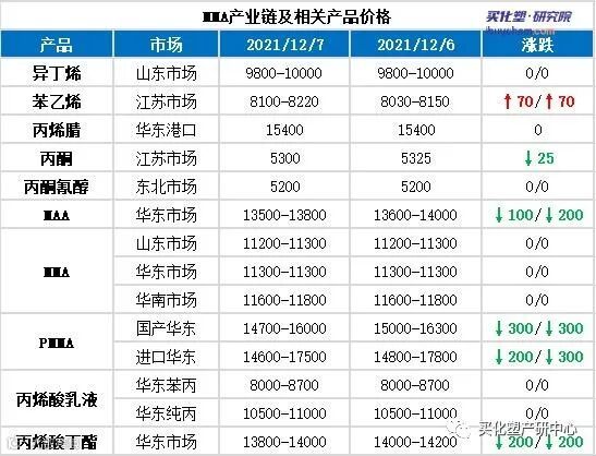 MMA及相关产业链相关产品价格下滑