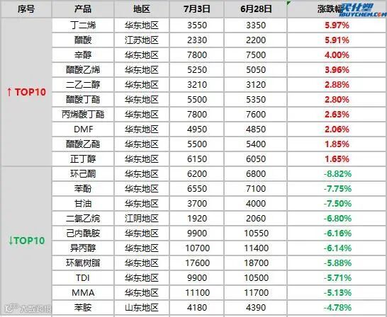 导读:本周涨幅前三产品分别是丁二烯、醋酸、辛醇,涨幅分别为5.97%、5.91%、↑4.00。