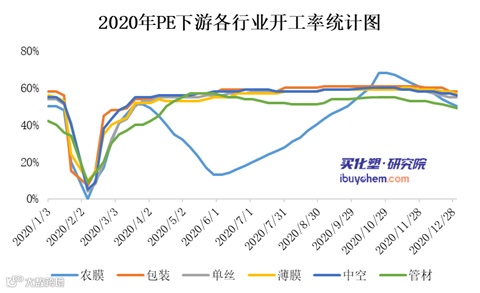据买化塑研究院【化塑产业链决策系统】跟踪的数据显示,PE下游各行业平均开工率为50%,同比下降2%。