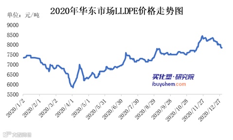据买化塑研究院【化塑产业链决策系统】跟踪的数据显示,2020年12月31日,华东市场LLDPE收盘价为7850元/吨,较2019年12月31日收盘价7350元/吨上涨6.8%。