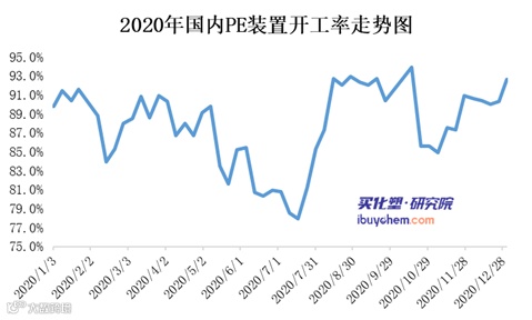 据买化塑研究院【化塑产业链决策系统】跟踪的数据显示,2020年国内PE装置平均开工率为87.6%,较去年上涨1.7个百分点。