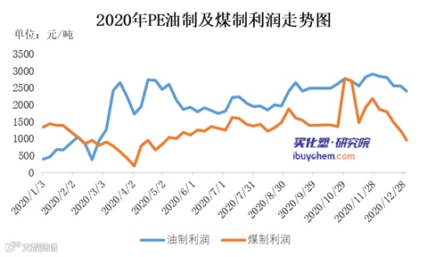 据买化塑研究院【化塑产业链决策系统】跟踪的数据显示,2020年PE油制平均利润为2030元/吨,同比增长20%;煤制平均利润为1303元/吨,同比下跌33%。(以LLDPE为例)