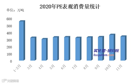 据买化塑研究院【化塑产业链决策系统】跟踪的数据显示,1-11月PE表观消费量为3507万吨,较去年同期增长12.9%。
