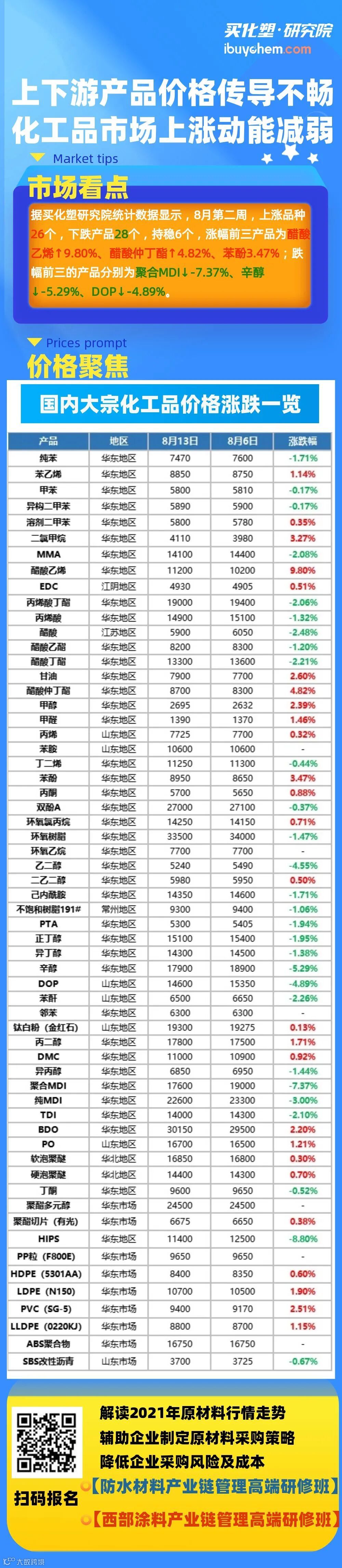 据买化塑研究院统计数据显示,8月第二周,上涨品种26个,下跌产品28个,持稳6个,涨幅前三产品为醋酸乙烯↑9.80%、醋酸仲丁酯↑4.82%、苯酚3.47%;跌幅前三的产品分别为聚合MDI↓-7.37%、辛醇↓-5.29%、DOP↓-4.89%。