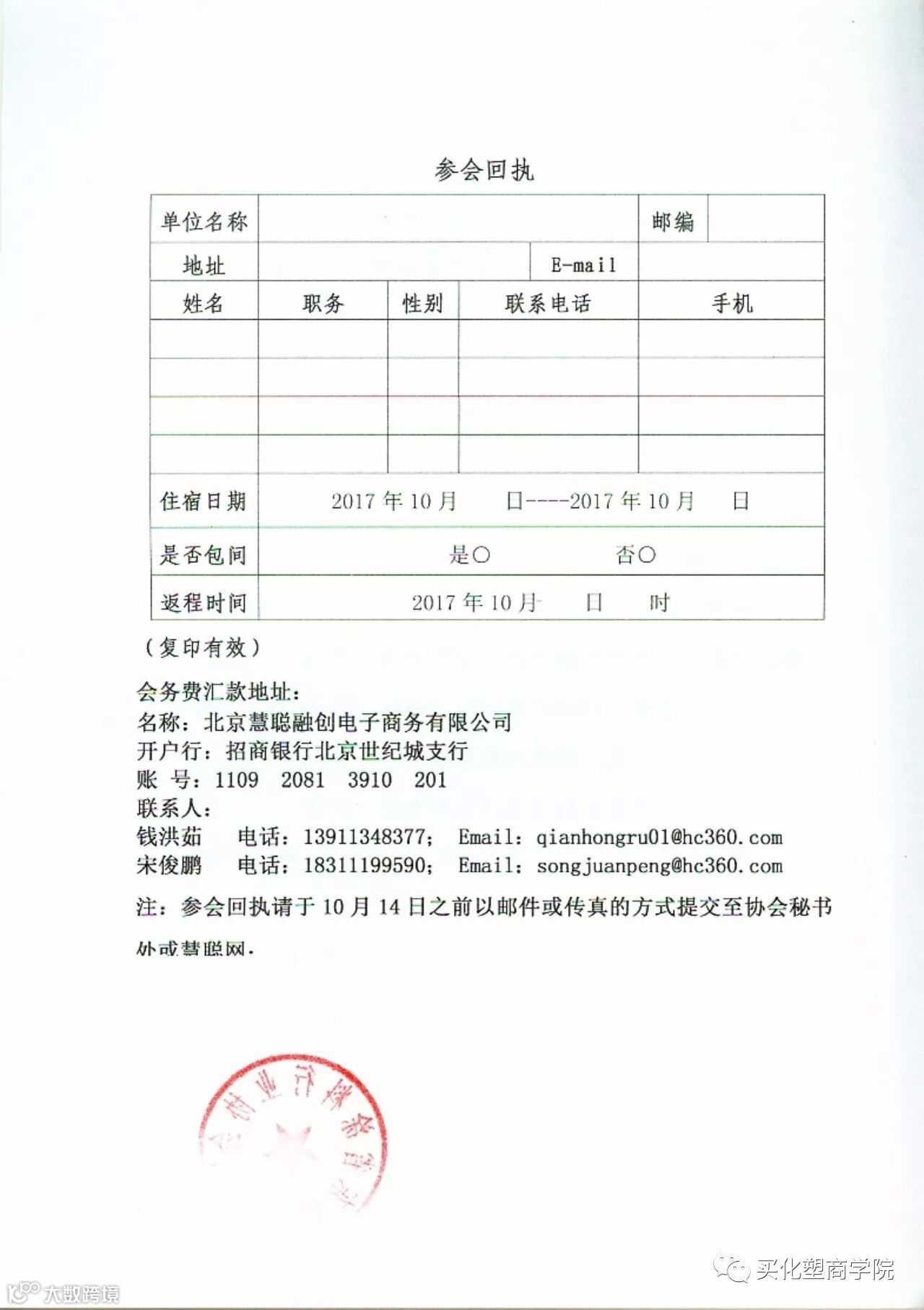 填写下表,请在10月8日之前回传至010-82297212或songjunpeng@hc360.com报名。报名成功后慧聪涂料网工作人员会通知您。席位有限,报名从速。