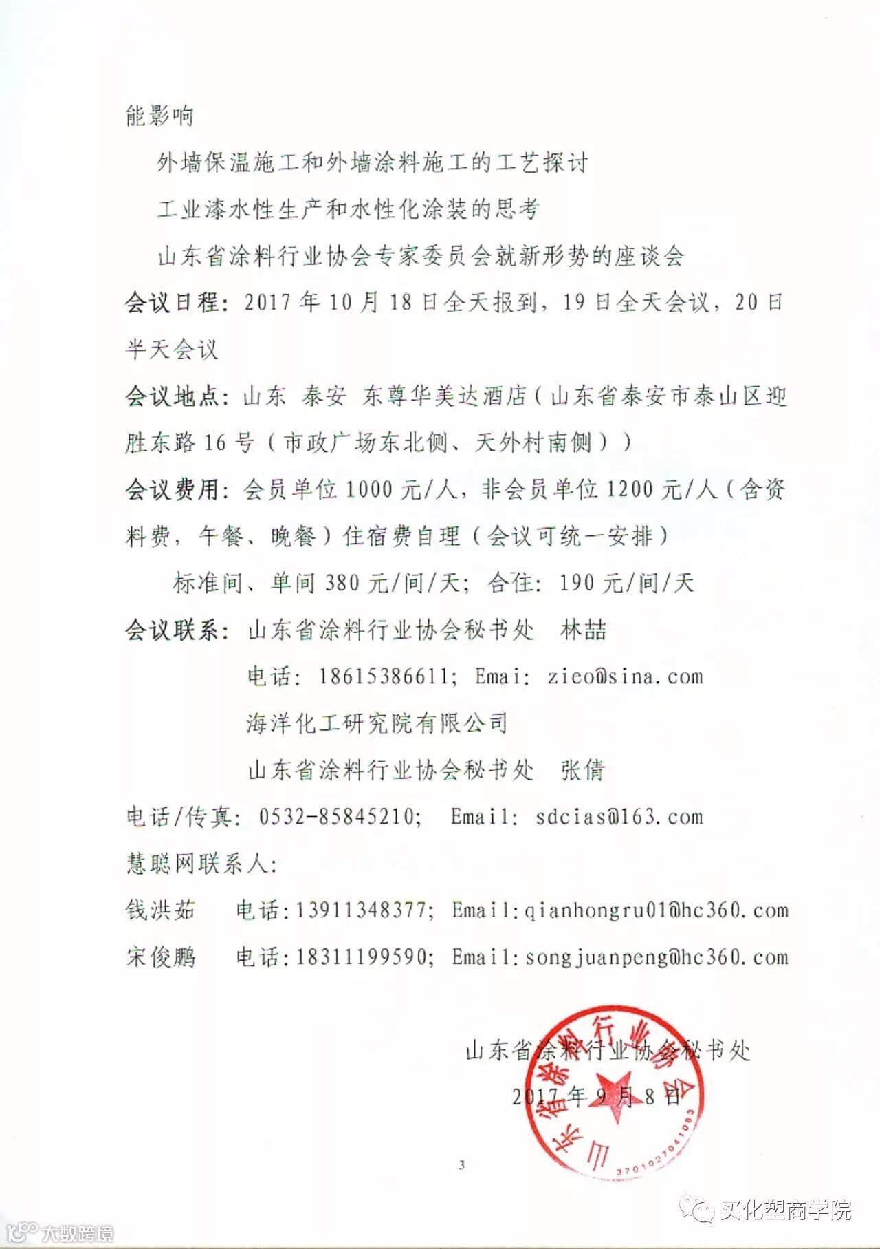会 务 费:1200元/人 ,山东涂协会员单位1000元/人(含资料费,午餐,不含住宿费,住宿费用请自理)。