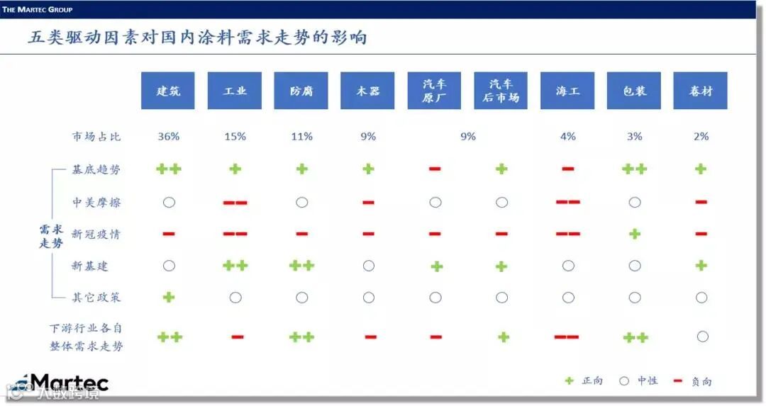 本文是这一系列的第一篇,分析涂料的八个主要下游领域在五类驱动因素的作用下,对涂料的需求量的变化。八个主要下游领域分别是建筑、工业、防腐、木器、汽车(含原厂和后市场)、海工、包装和卷材,而五类驱动因素则分别为行业的基底趋势、新冠疫情、中美摩擦、新基建政策及其它相关政策。分析的结论如下图所示,其中的代表需求受到特定驱动因素刺激会上升,-代表需求受到抑制会下降,和-的数量代表影响的程度,代表需求没有受到影响或所受影响不明显。