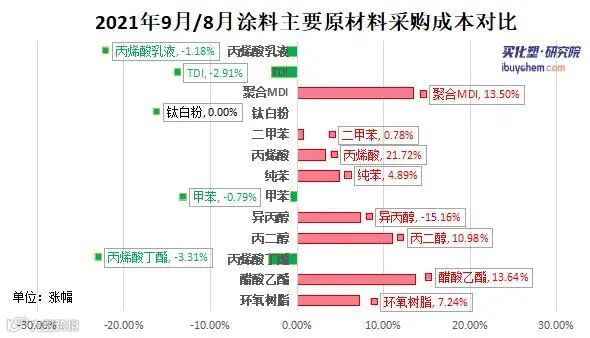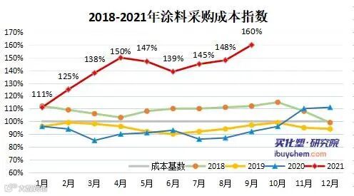 9月,国际油价不断推高刷新年内高点,月底布伦特原油期货价格再度逼近80美元/桶,国际油价升至近三年来的高点。同时,多省开始限制高能耗企业用电总量、提高电价、限制用电时段等措施。受此影响部分产品供应收缩,价格大幅上涨。据买化塑研究院涂料采购成本指数显示,9月指数为160%,环上涨12个百分点,涂料主要原材料聚合MDI、环氧树脂、醋酸乙酯、丙二醇、异丙醇、纯苯、丙烯酸等产品价格上涨。