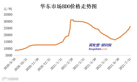 7月份,BDO市场一路上行。从影响因素来看,货源供应紧张是导致BDO价格上涨的关键。具体来看,上游美克二期、屯河及新业等装置停车检修,以及暴雨导致部分地区货源流通补偿,导致供应紧张,而其下游PTMEG-氨纶产业链、PTMEG、GBL-NMP产业链需求较好,更是为行情提供支撑。