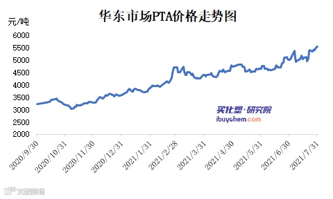 7月份,PTA市场延续上行。月内虽然原油波动幅度较大,但仍维持高位,对对PTA形成一定支撑。虽然月内有新装置投产,但部分装置检修以及台风带来的封航,市场供应量处于偏紧状态。在下游聚酯开工率基本维持的局面下,月内PTA价格震荡走高。