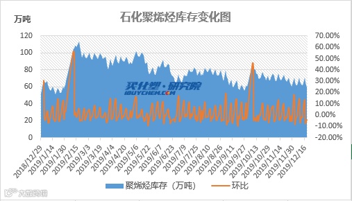 据买化塑研究院【化塑产业链决策系统】跟踪的数据显示,12月19日,石化聚烯烃库存为59.5万吨,较昨天下降5.3%,较周一下库存数据下降14.9%。